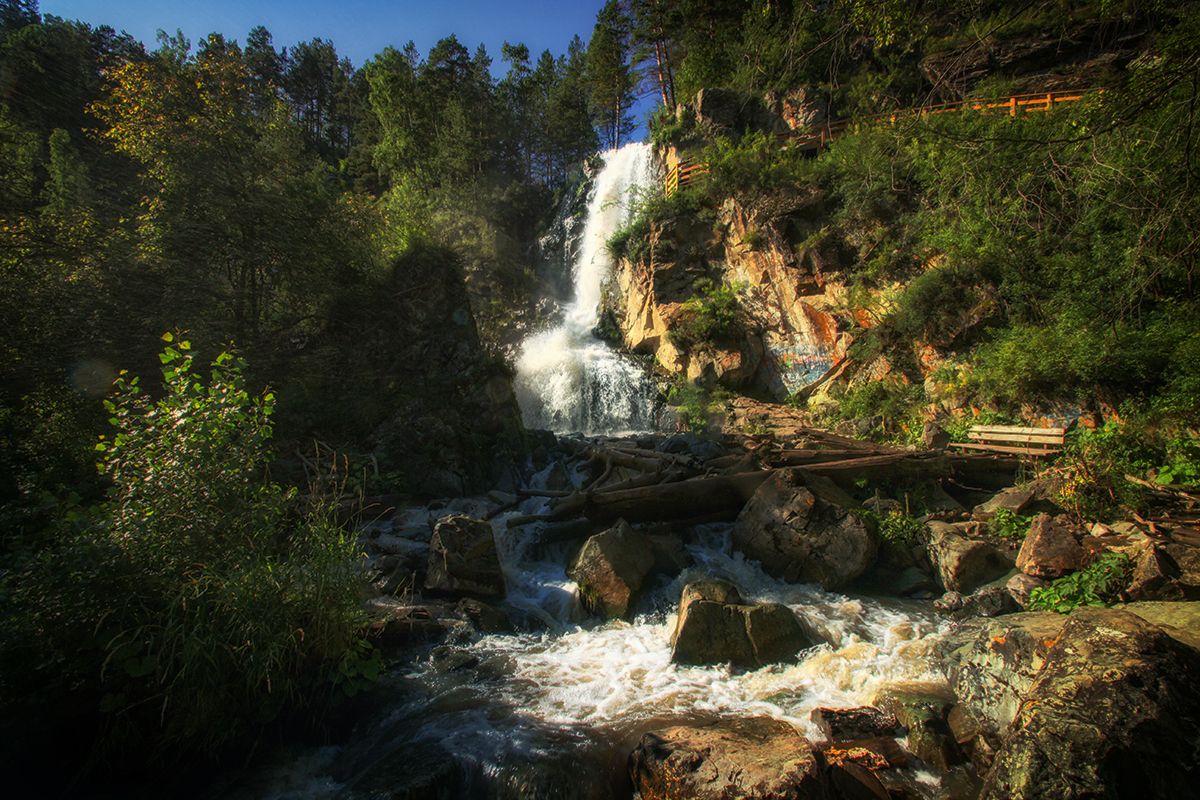 Сначала мы посетим висячий камень. Место, где пару тысяч лет назад был водопад. Но осталось короткое, узкое ущелье, где застрял огромные валун. Далее отправимся к Еландинской штольне. Вот тут без фонарика не обойтись, ведь штольня уходит на 50 метров в гору. Прямо в ее толщу. Зачем? В 70 годах здесь хотели построить огромную Гэс на Катуни.
