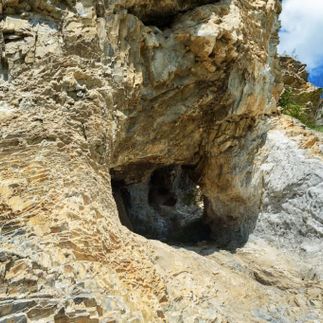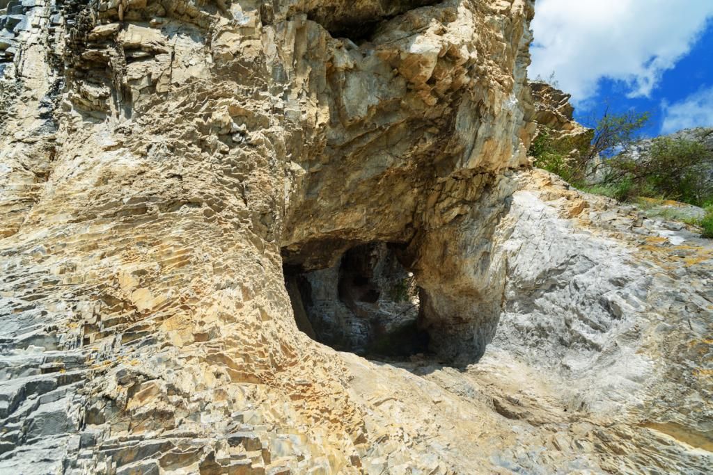 И вот мы добрались до сквозной пещеры в известняковой толще. Пещера встречает нас аркой. А далее основной вход, Не если есть вход, то есть и выход. И мы пройдем пещеру насквозь!