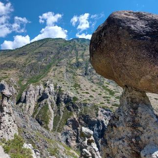 Далее пешая прогулка в урочище Ак-Курум к Каменным грибам. Необычные скальные образования напоминают грибы, благодаря своим шляпкам и ножкам. Они словно живут своей жизнью, меняя форму и размер под воздействием природных сил. Поднимаясь к Каменным грибам, насладимся потрясающим видом на извилистые воды реки Чулышман и её тихое урочище.