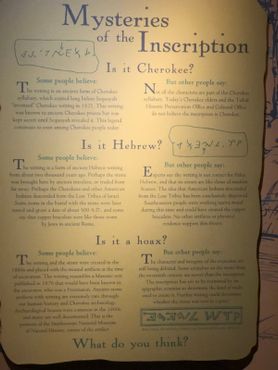 О камне забыли примерно на 70 лет, пока этнолог по имени Джозеф Мэхан не пришёл в замешательство из-за того, что буквы на нём не были похожи на буквы алфавита чероки. Он отправил фотографию своему другу Сайрусу Гордону, который понял, что в перевёрнутом виде эти символы выглядят в точности как палеоеврейские буквы.