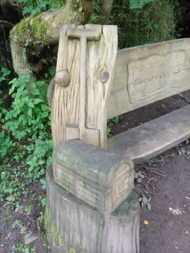 Рядом с пещерой стоит деревянная скамья, украшенная резьбой, которая отсылает к книге. На одной стороне скамьи изображён сундук с сокровищами и лопата, а на другой стороне — попугай, череп и крюк. На спинке скамьи вырезана карта сокровищ с крестом.