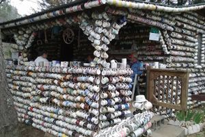 Полная кофейных кружек хижина, где гости могут сделать свой вклад, если найдут свободный гвоздь