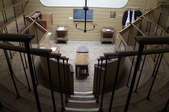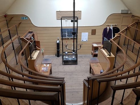 Зачастую травмы не позволяли пациентам своими силами подняться в операционный театр по винтовой лестнице, и поэтому их доставляли с помощью системы блоков через отверстие в стене за классной доской. Пол был застелен соломой, чтобы кровь не капала на посетителей церкви под театром.