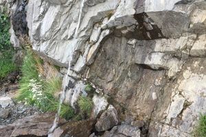 Чистая питьевая вода течёт из неприметной трубы в скале вдоль дороги