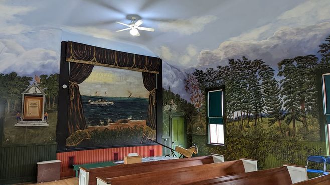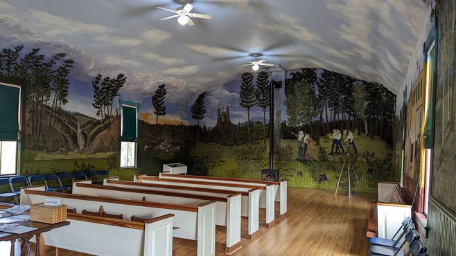 Весной 1897 года Хюпеден добрался до Валтона. Местное отделение братства Современных лесорубов Америки поручило ему разрисовать театральный занавес, оплатив проживание и питание в близлежащей гостинице. Его работы произвели впечатление на членов братства, и Хюпедена попросили украсить их молитвенный дом. Следующие два года он занимался росписью стен и потолка, покрывая буквально каждый сантиметр поверхности муралами с изображением обрядов, идеалов и деятельности Современных лесорубов Америки.